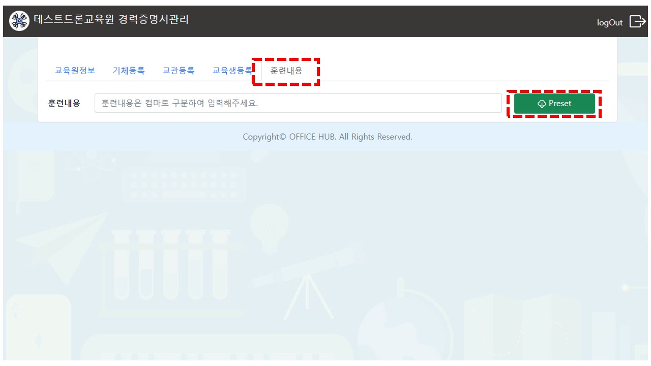 각 원의 상황에 맞게 훈련내용을 직접 입력하거나 Preset 버튼을 클릭해서 추천 훈련내용을 가져올 수 있습니다.