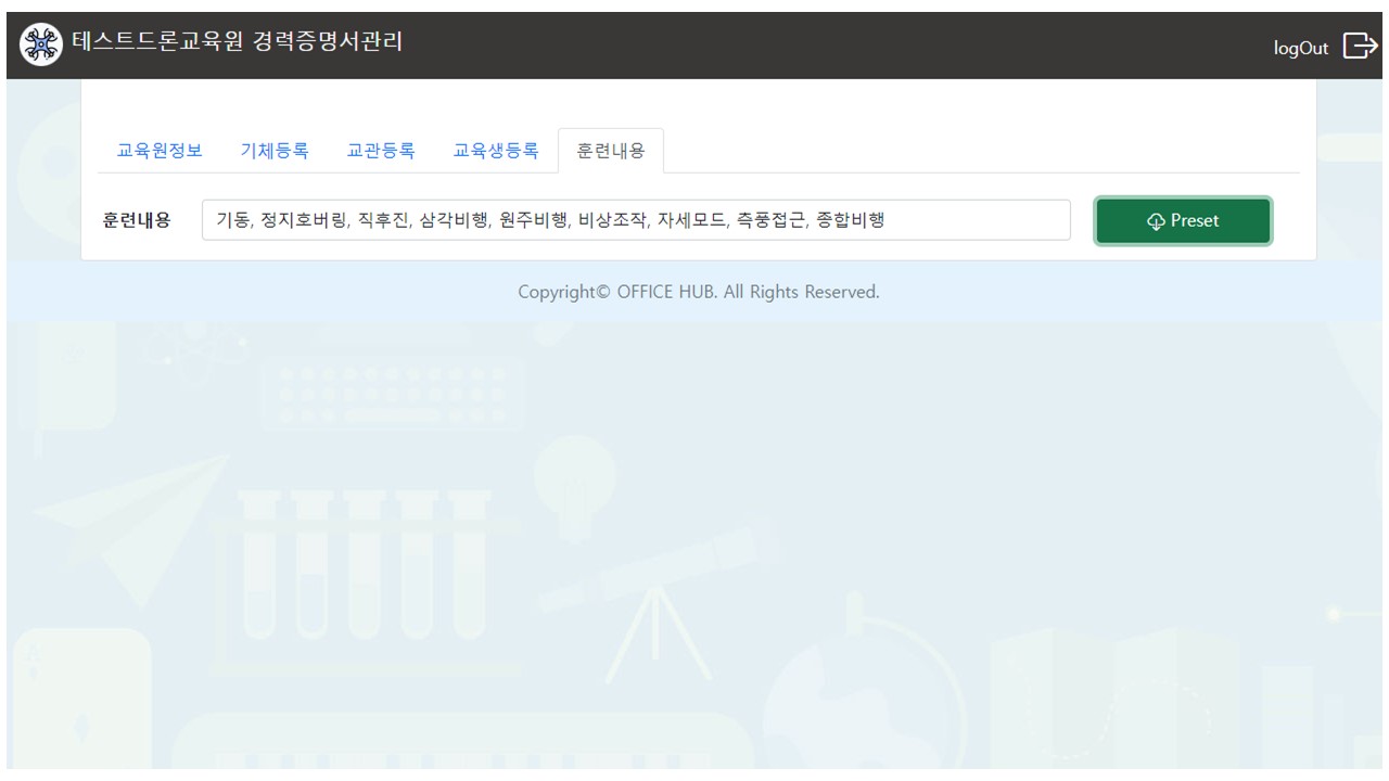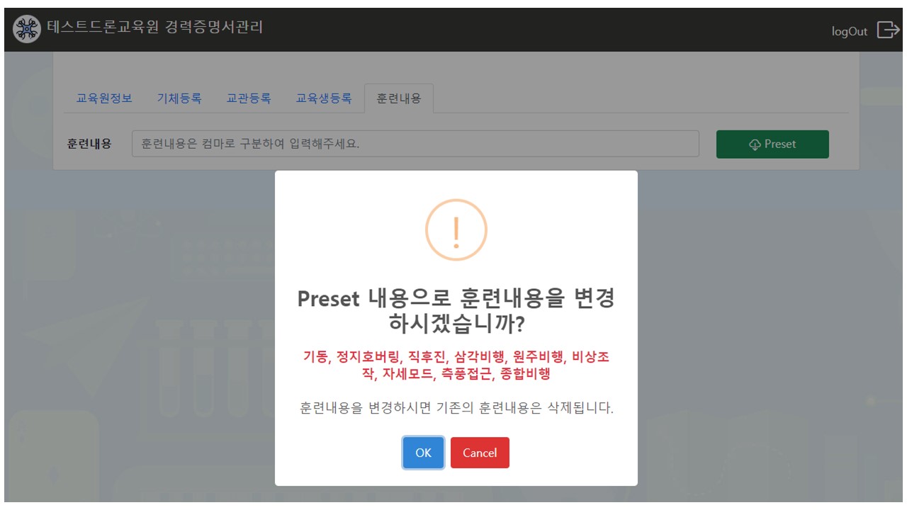 일반적인 훈련 내용인 "기동, 정지호버링, 직후진, 삼각비행, 원주비행, 비상조작, 자세모드, 측풍접근, 종합비행" 등록할 수 있는 Preset 버튼이 있습니다.