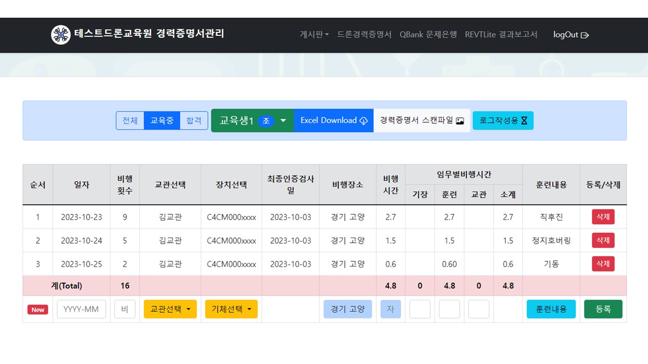 비행일자, 비행횟수, 교관선택(교관을 선택하면 자동으로 관리기체가 선택 됩니다. ), 임무별비행시간, 훈련내용을 입력한 후에 등록버튼을 눌러서 비행기록을 등록합니다.