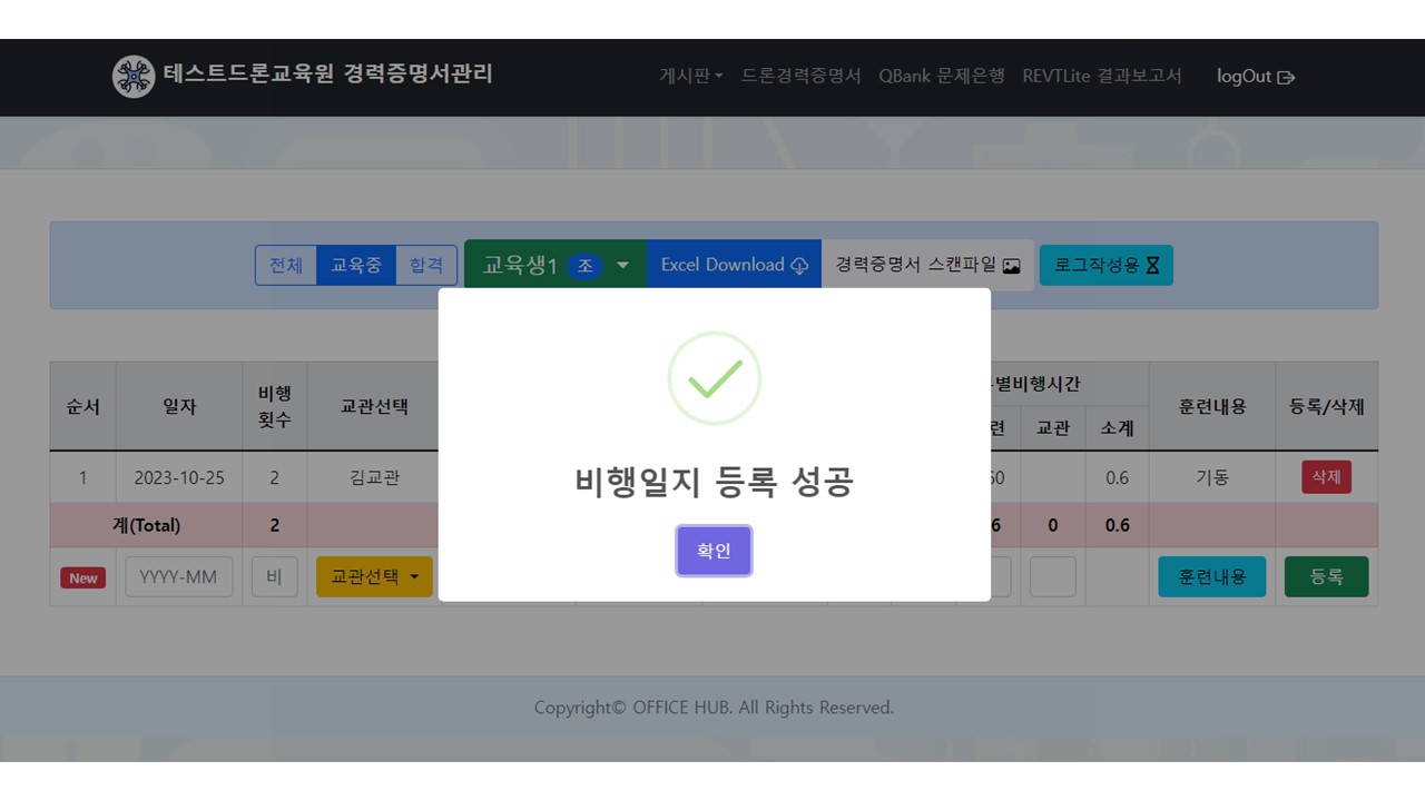모든항목이 이상없이 입력되었으면 아래와 같이 비행일지가 성공적으로 등록됩니다.