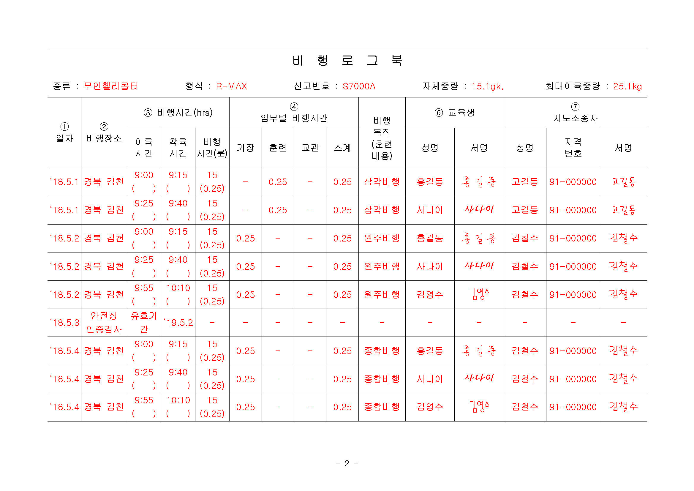 초경량비행장치 비행 로그북 작성 및 주의사항 및 예시
